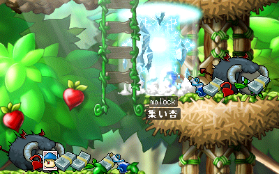 火力上昇に浮かれつつ、バクを上の段から巻き込んで狩っていた矢先、突然赤いものが。