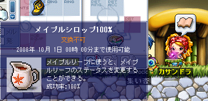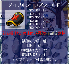 ドロップした瞬間のSSは撮り損ねたのですが、クラピからメイプルシールドを手に入れました。